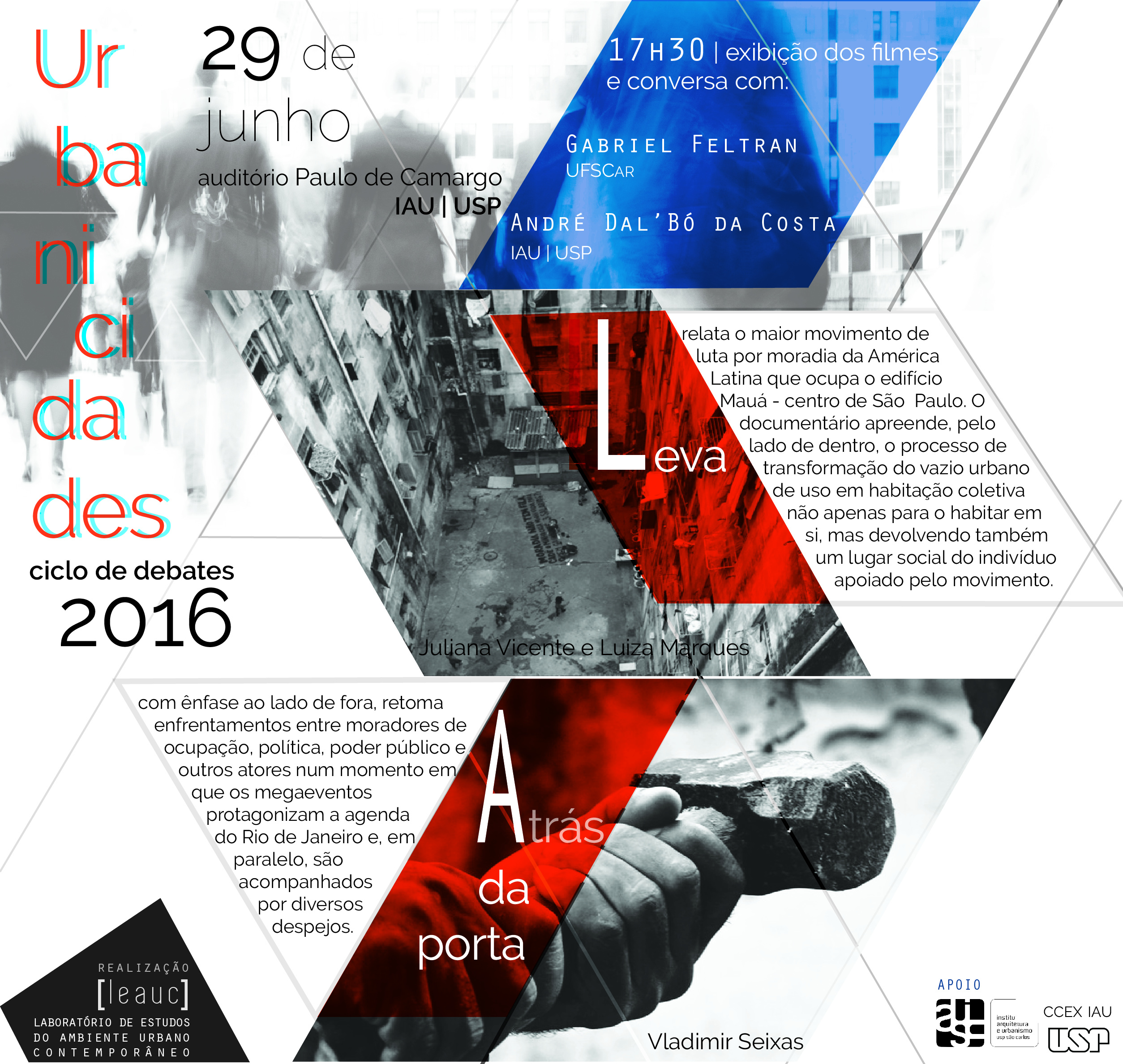 O Cine Urbanicidades 2016, do grupo de pesquisa LEAUC, promoveu no último dia 29 a exibição dos documentários "LEVA" (2011), de Juliana Vicente e Luiza Marques e "ATRÁS DA PORTA" (2010), de Vladimir Seixas. Contando com a presença do professor Gabriel Feltran (UFSCar) e André Dal´Bó (IAU-USP) para debate e contribuições após a exibição*.