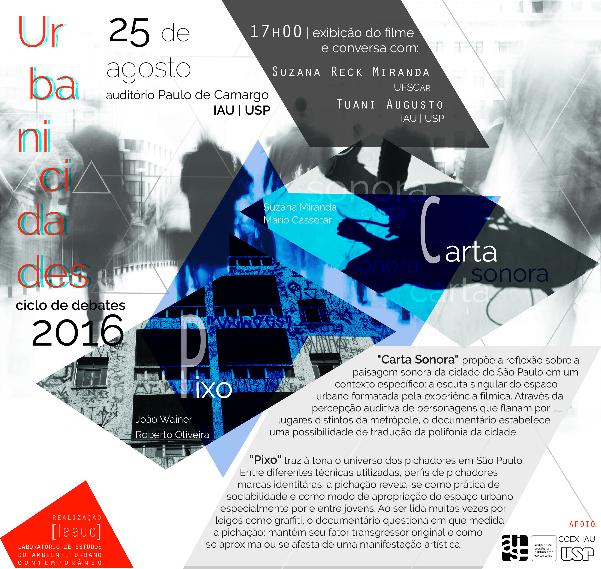 O Cine Urbanicidades 2016, do grupo de pesquisa LEAUC, promoverá no dia 25 de agosto a exibição dos documentários "CARTA SONORA" (2010), de Suzana Miranda e Mario Cassetari e "PIXO" (2009), de João Wainer e Roberto Oliveira. Contando com a presença de uma das diretoras de Carta Sonora, Suzana Miranda (UFSCar) e Tuani Augusto (IAU-USP) para debate e contribuições após a exibição*.