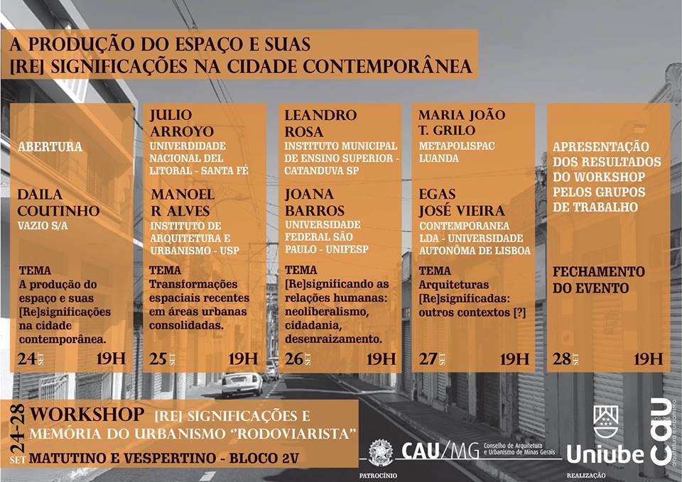 Na semana do dia 24 ao dia 28 de setembro, os pesquisadores Manoel Rodrigues Alves e Camila Guimarães participaram do II Simpósio e Workshop Internacional de Arquitetura e Urbanismo, com o tema "A Produção do Espaço e suas (Re)significações na Cidade Contemporânea". O evento foi realizado pelo curso de Arquitetura e Urbanismo da Universidade de Uberaba - UNIUBE, com apoio do CAU-MG.