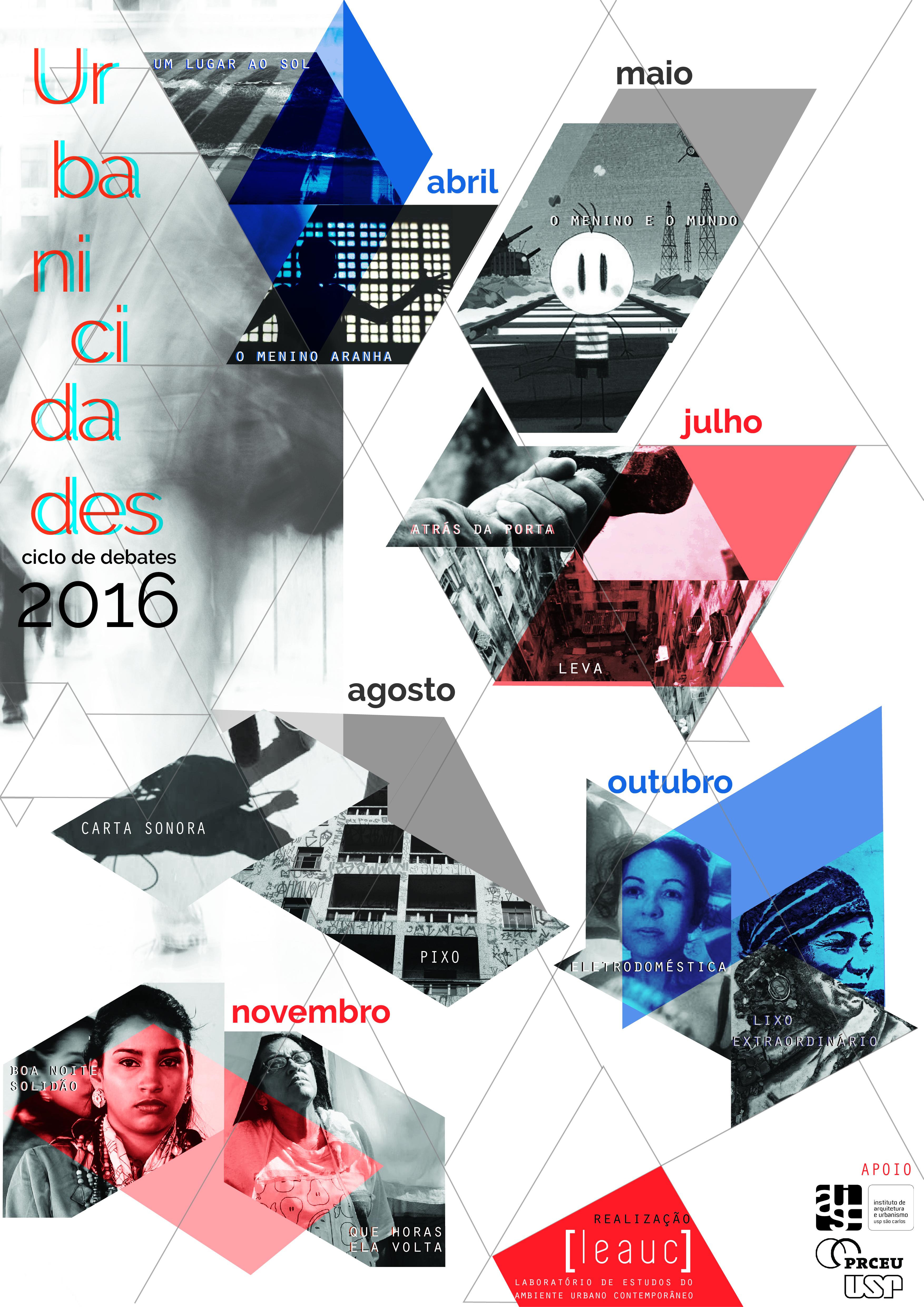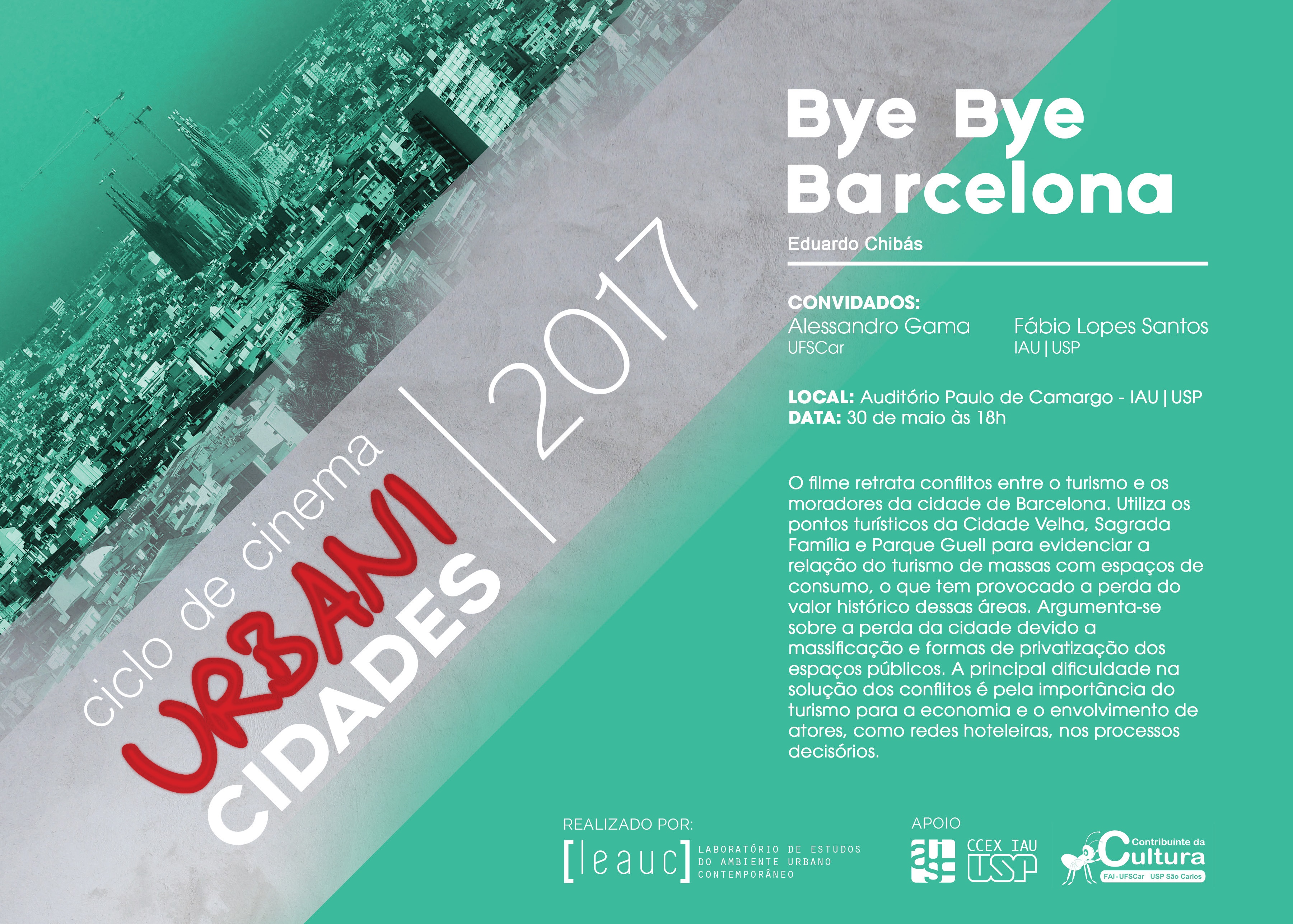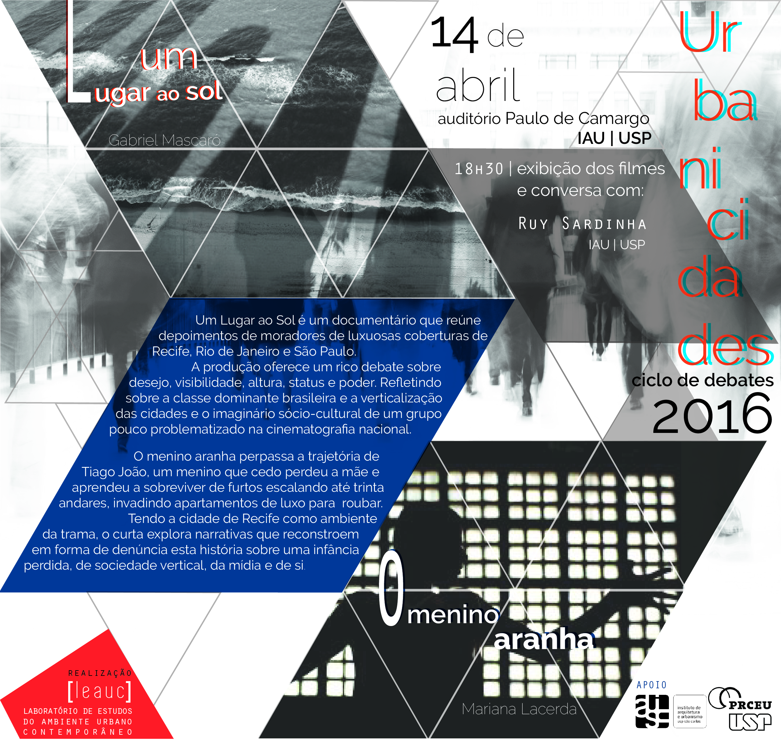 O LEAUC (Laboratório de Estudos do Ambiente Urbano Contemporâneo) convida a todos para participarem do nosso Ciclo Urbanicidades de cinema e debate 2016, o qual ocorrerá durante todo o ano. Nossa proposta é exibir os filmes e propor um debate posterior com convidados, internos e externos. Deste modo, procuramos estreitar e fortalecer a relação com outros Grupos de Pesquisa e Universidades, de modo a fomentar o debate e a construção coletiva de conhecimento.
