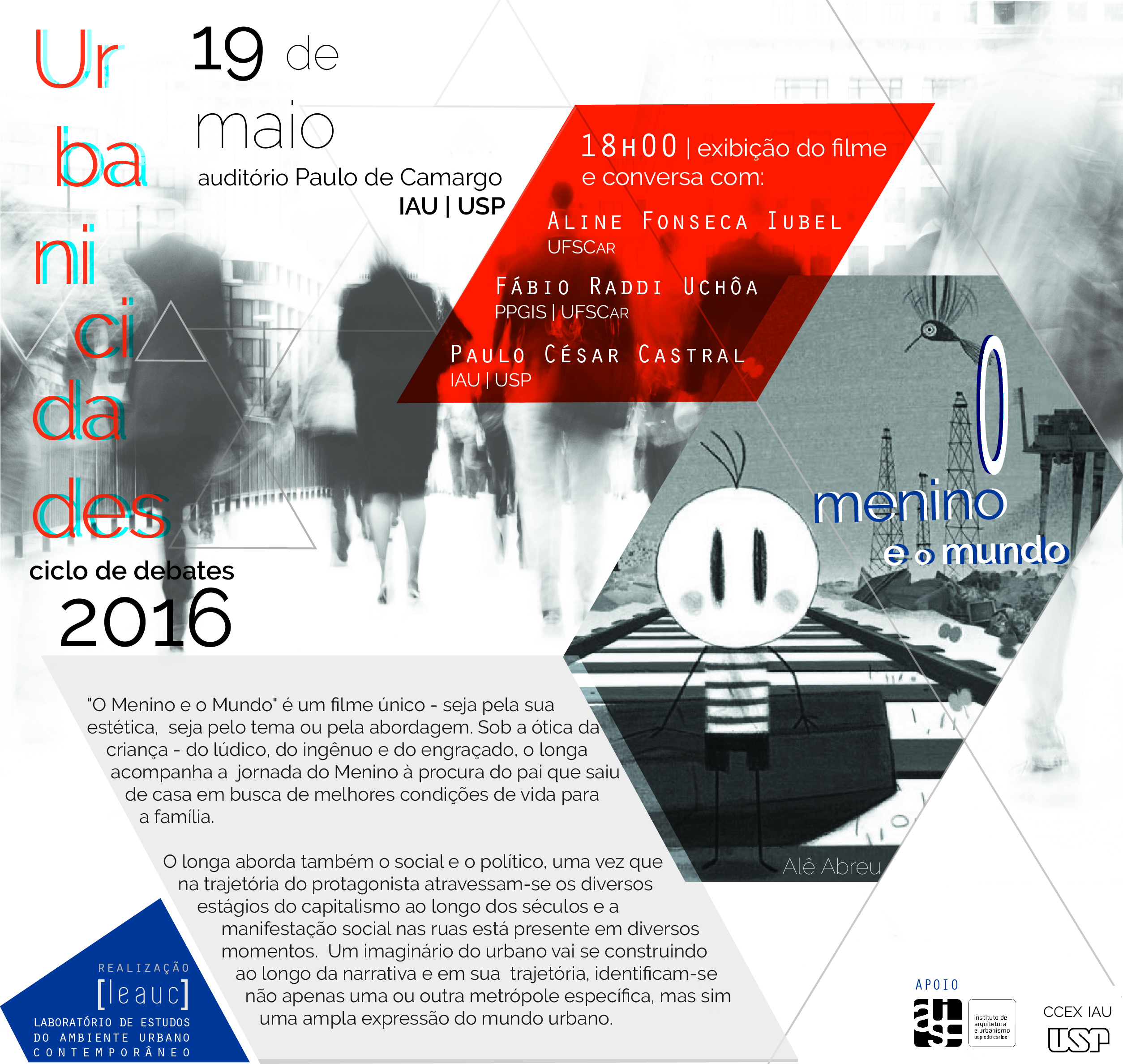 O Cine Urbanicidades 2016, do grupo de pesquisa LEAUC, promoveu no último dia 19 a exibição do filme O Menino e o Mundo (2013) de Alê Abreu, Contamos com a presença dos convidados Aline Fonseca Iubel (Doutora em Antropologia | UFSCar), Fábio Raddi Uchôa (PPGIS | UFSCar), Paulo César Castral (IAU | USP) para debate e contribuições após a exibição*.