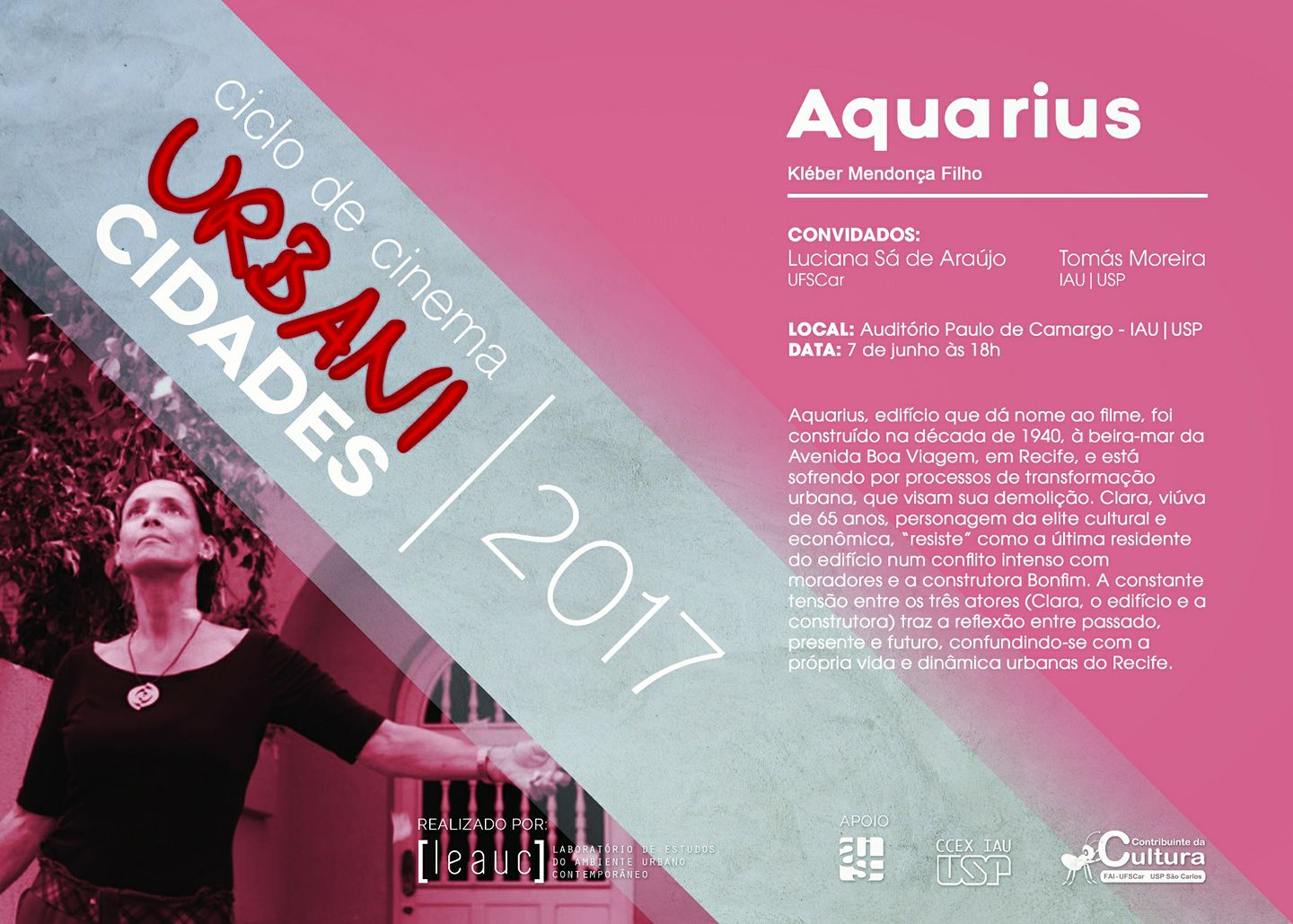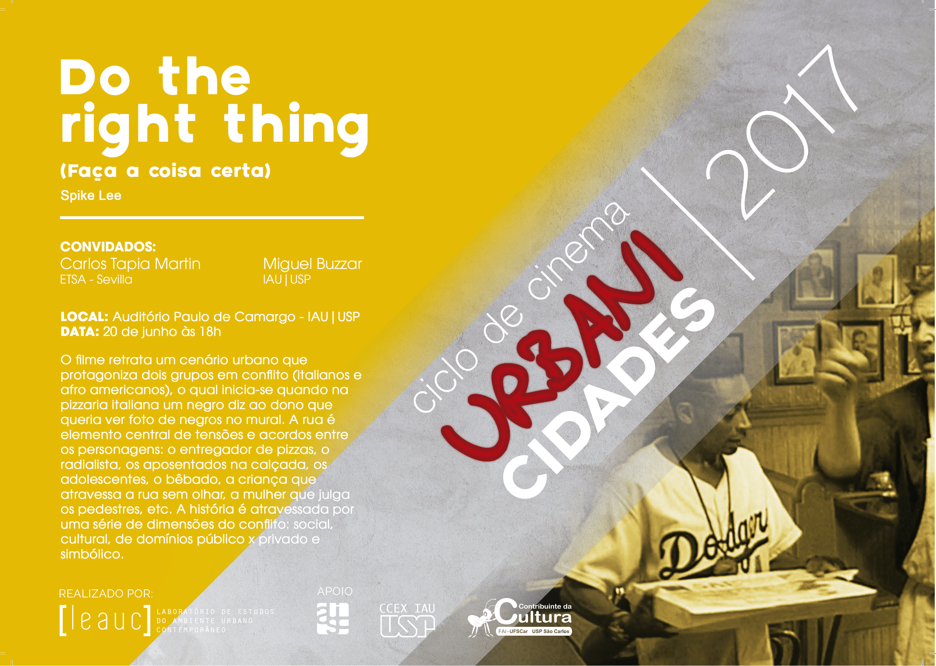Após a exibição de cada filme, será proposto um debate com uma dupla de convidados, de modo a ampliar a reflexão sobre as temáticas trabalhadas e aproximá-las às pesquisas desenvolvidas no programa de pós-graduação do IAU USP. O grupo de pesquisa LEAUC convida todos os interessados a participar dos eventos. A atividade é gratuita e aberta a todos que queiram assistir e participar dos debates. Haverá certificado de participação para aqueles que estiverem presentes em ao menos dois encontros.