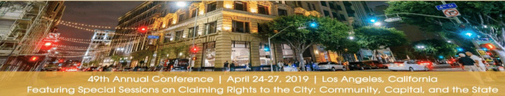 Os pesquisadores Manoel Rodrigues Alves e Maíra Cristo Daitx participaram, entre os dias 24-27 de abril, do evento "49th Annual Conference | Urban Affairs Association", que ocorreu em Los Angeles, EUA. No dia 26, os autores apresentaram o trabalho "Real Estate and Stakeholders' Role in the Creation of Lifestyles: The Co-Production o Urban Spaces of Public and Private Life", realizado em coautoria, em sessão organizado pelo projeto Highrise, coordenado pelo Prof. Manoel, denominada "Highrise Living and Urban Transformations: towards a built-high gentrification?". Os pesquisadores Marcel Fantin e Milena Cristina Sartori, juntamente ao pesquisador Júlio Pedrassoli (UFBA), também tiveram seu trabalho "Spatial Analysis and the Inclusive City: a technical approach in the High-Rise living project" aprovado para apresentação, e foram representados pelo Prof. Manoel. Outros pesquisadores do projeto, de outras instituições nacionais e francesa, também participaram da sessão. Informações sobre o evento: https://urbanaffairsassociation.org/conference/