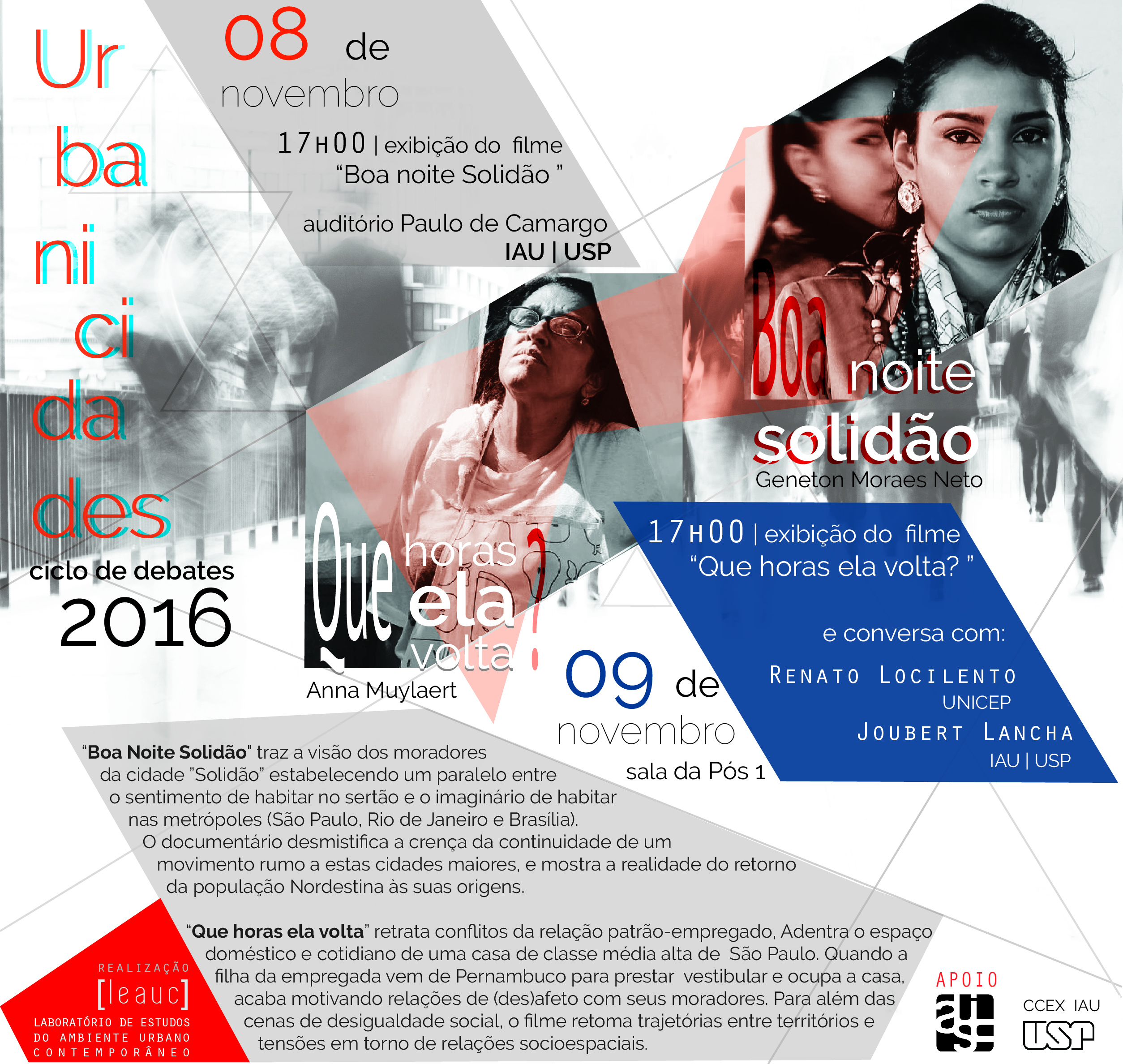 O Cine Urbanicidades 2016, do grupo de pesquisa LEAUC, promoverá nos dias 08 e 09 de NOVEMBRO a exibição do documentário "BOA NOITE SOLIDÃO" (2016), de Geneton Moraes Neto e do filme "QUE HORAS ELA VOLTA?" (2015), de Anna Muylaert. Contando com a presença dos professores Renato Locilento (UNICEP) e Joubert Lancha (IAU-USP) para debate e contribuições após a exibição*.